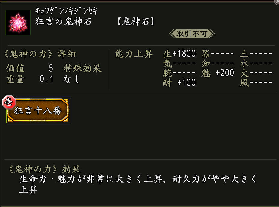 NEW ●狂言の鬼神石×1 効果:鬼神の力「狂言十八番(きょうげんじゅうはちばん)」が付いた鬼神石。