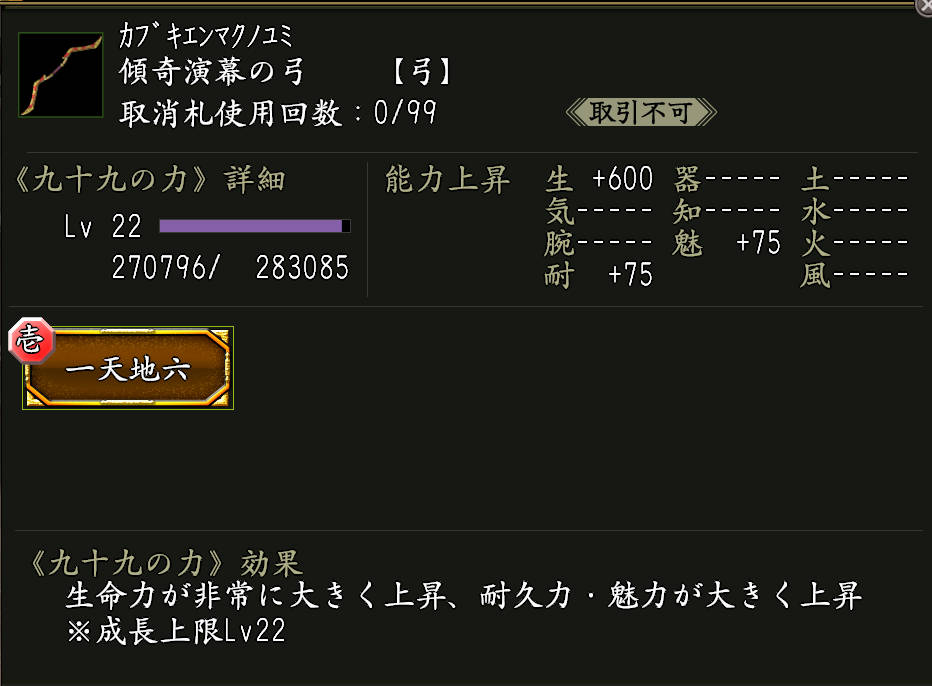 ・《傾奇演幕の弓》 効果:九十九の力「一天地六(いってんちろく)」が付いた武器。