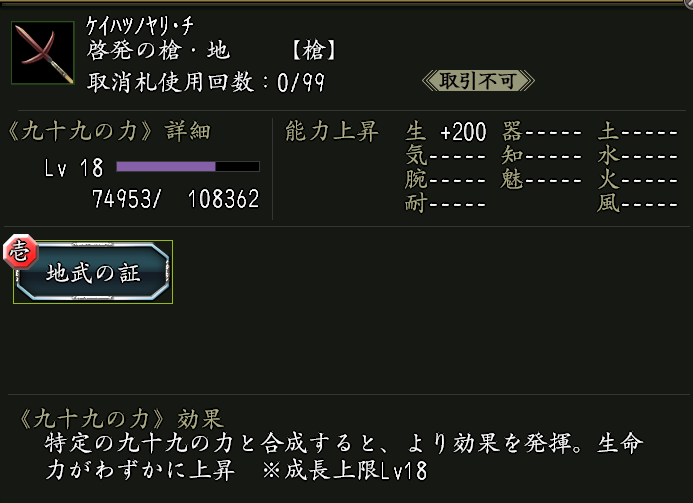啓発の槍・地 | 九十九の力《地武の証》が付いた九十九武器。 |
