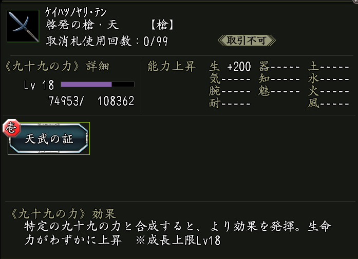 啓発の槍・天 | 九十九の力《天武の証》が付いた九十九武器。 |