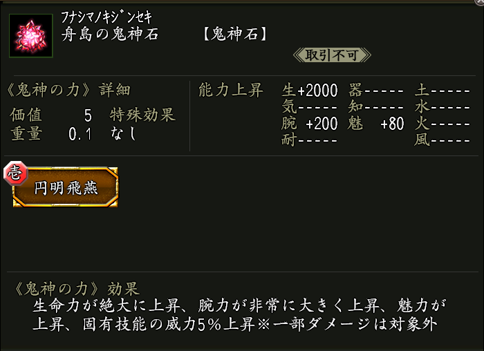 効果:鬼神の力「円明飛燕(えんめいひえん)」が付いた鬼神石。