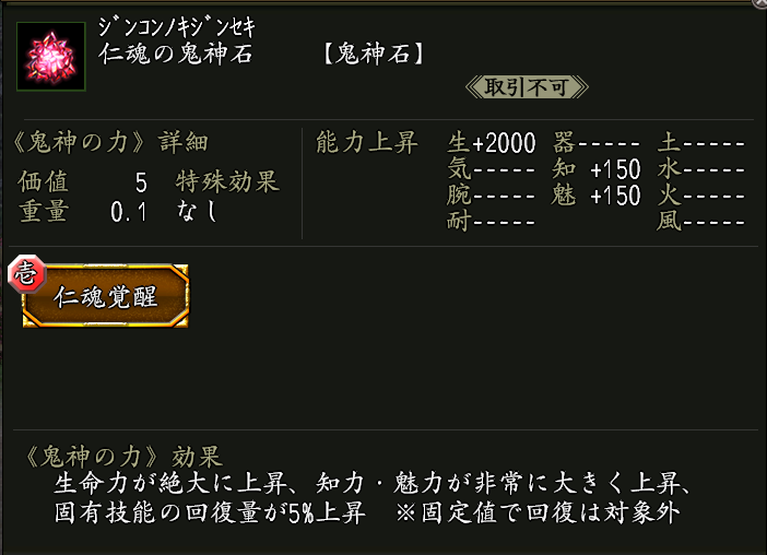 効果:鬼神の力「仁魂覚醒(じんこんかくせい)」が付いた鬼神石。