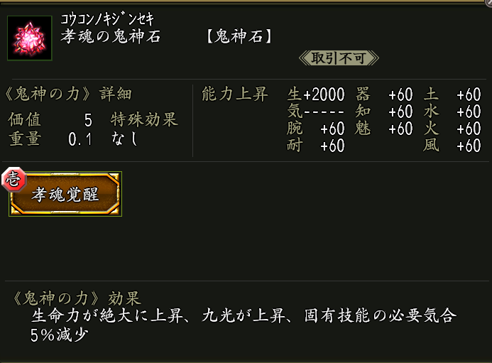 効果:鬼神の力「孝魂覚醒(こうこんかくせい)」が付いた鬼神石。
