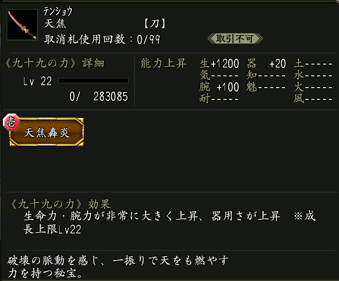 効果:九十九の力「天焦轟炎(てんしょうごうえん)」が付いた武器。