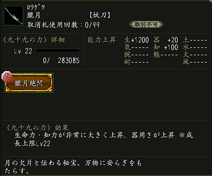 効果:九十九の力「朧月絶閃(ろうげつぜっせん)」が付いた武器。