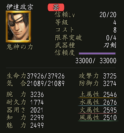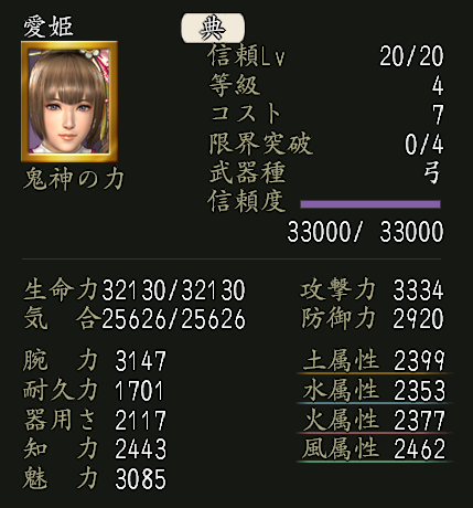 | 水属性上昇Lv.3 | 家臣闘練で修練内容に配置された時に、水属性の上昇量を上げる。 | |||||