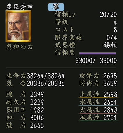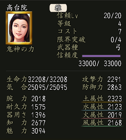 | 魅力上昇率向上Lv.3 | 家臣闘練で修練内容に配置された時に、魅力の上昇割合を上げる。 | ||||||