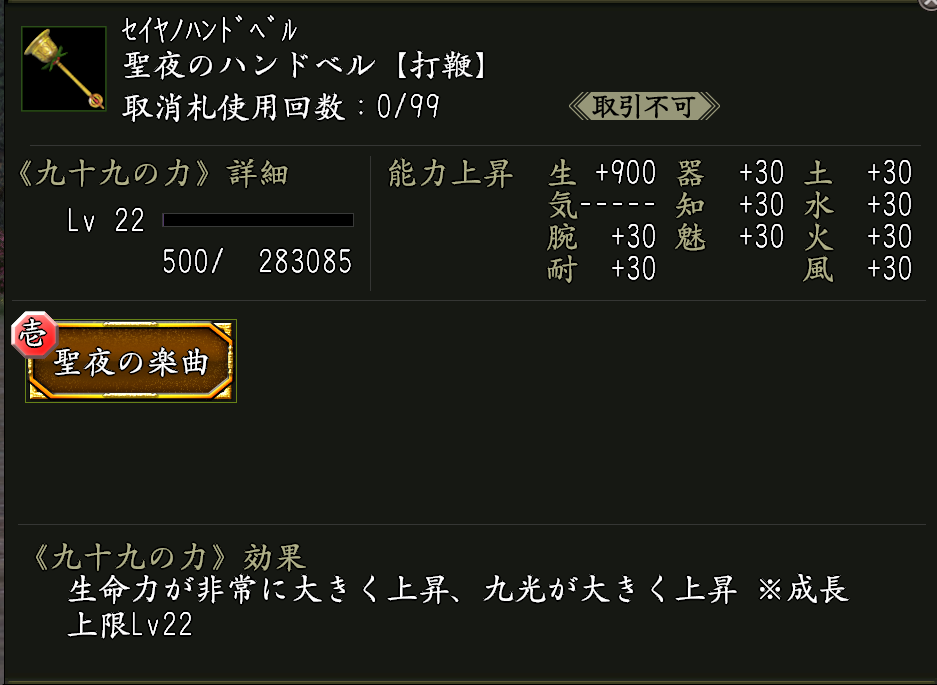 使用すると、下記アイテムを取り出せる。 ●聖夜九十九箱・巳×1 効果:使用すると、下記アイテムから1つ選んで入手できる。 NEW ・聖夜のハンドベル×1 効果:九十九の力「聖夜の楽曲(せいやのがっきょく)」が付いた九十九武器。
