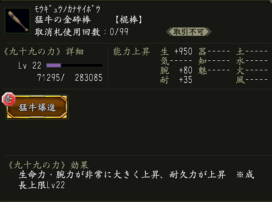 効果:九十九の力「猛牛爆進(もうぎゅうばくしん)」が付いた武器。
