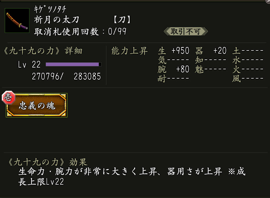 効果:九十九の力「忠義の魂」(ちゅうぎのたましい)が付いた武器。
