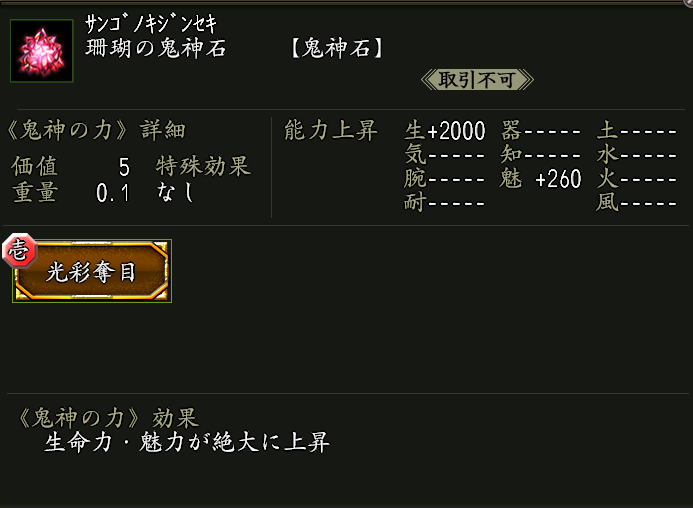 効果:鬼神の力「光彩奪目(こうさいだつもく)」が付いた鬼神石。