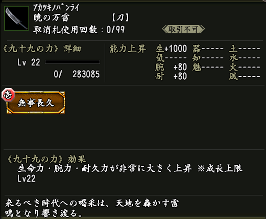 効果:九十九の力「無事長久(ぶじちょうきゅう)」が付いた武器。