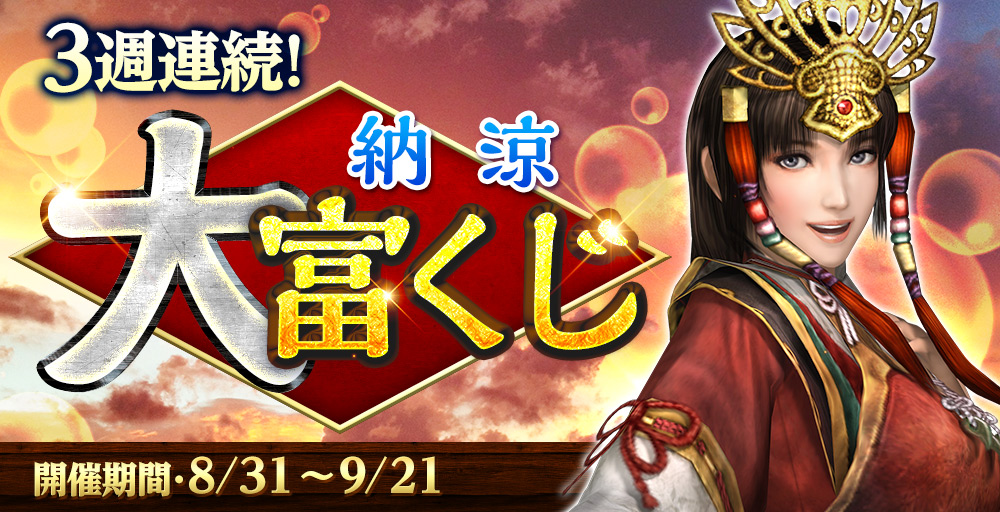 「三週連続! 納涼大富くじ」にて富くじを購入された方の中から、発売回ごとに1名様(計3名様)に『信長の野望 Online ~勇士の章~ プレミアムバーチャルパック』をプレゼントいたします。