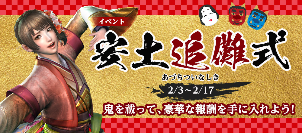 使用することで、安土追儺式イベント期間中、「鬼祓評価点」「掃討評価点」獲得量を+50%増加する。