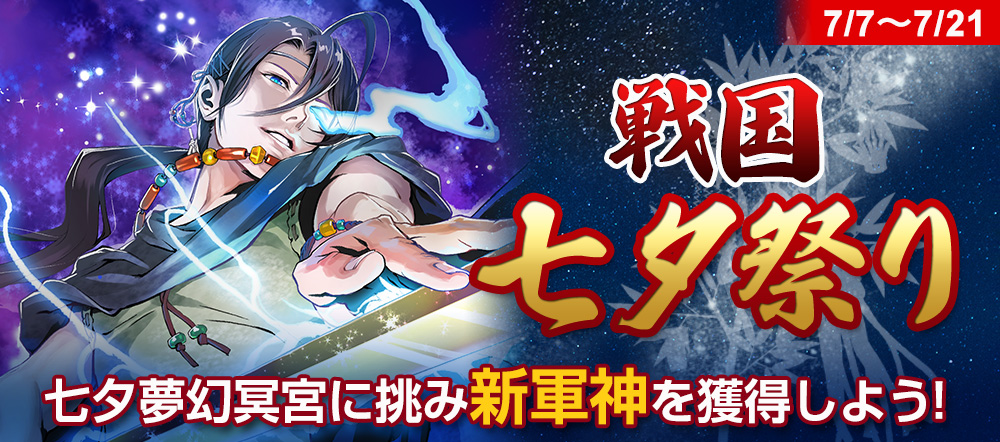 今年も《からくり桜子》が安土で七夕祭りを開催しています。しかし星神《天津甕星(アマツミカボシ)》がお怒りになってしまい、このままでは七夕祭りを開催してもみんなの願いは届きそうにありません。怒りを鎮めるため、期間限定ダンジョン「七夕夢幻冥宮」を登って祈りの力を増幅させる《天の川の雫》を取ってきましょう。