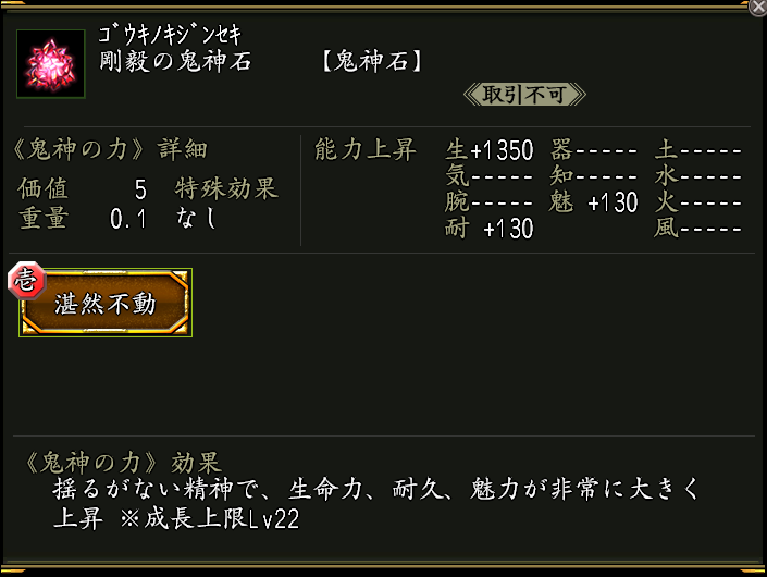 使用すると下記アイテムを取り出せる。 NEW ●剛毅の鬼神石×1 効果:鬼神の力「湛然不動(たんぜんふどう)」が付いた鬼神石。 ●虚空の鬼神石×1