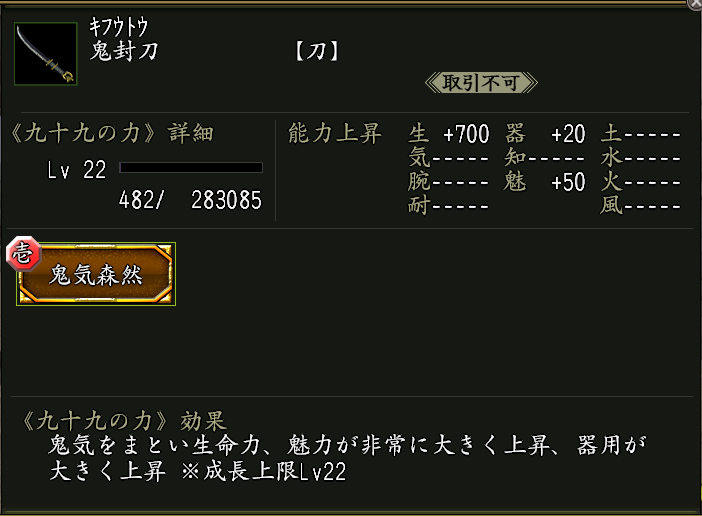 九十九の力「鬼気森然」(黄金枠)がついた武器。