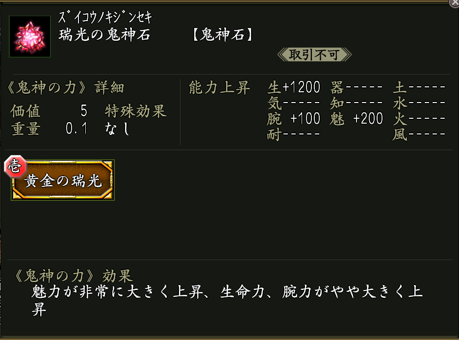 効果:鬼神の力「黄金の瑞光(おうごんのずいこう)」が付いた鬼神石。