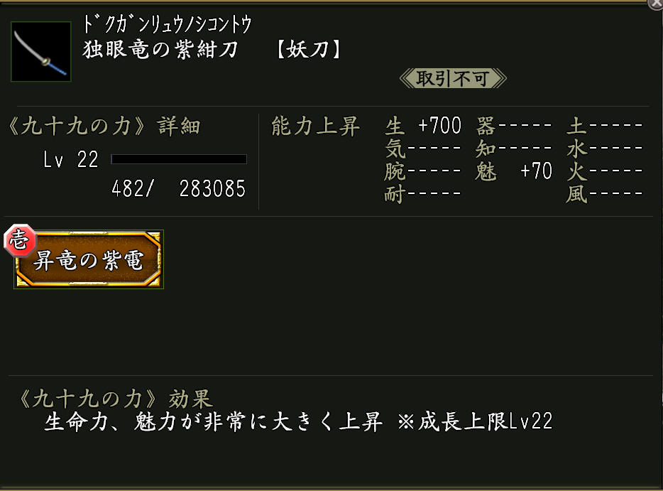 効果:九十九の力「昇竜の紫電(しょうりゅうのしでん)」が付いた武器。