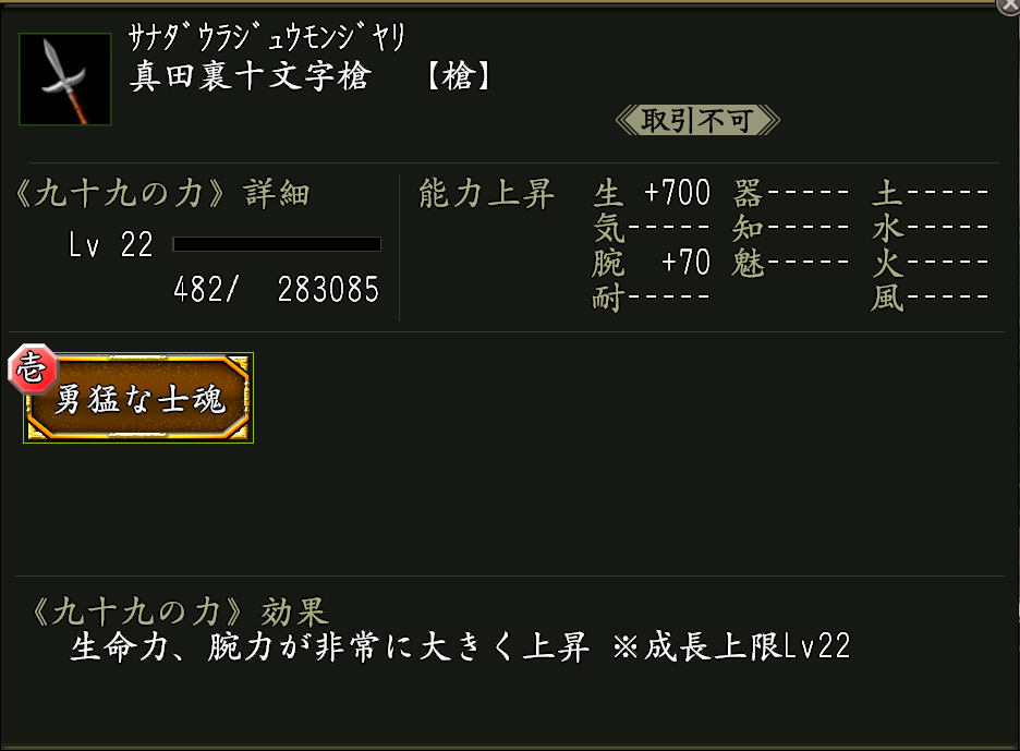 効果:九十九の力「勇猛な士魂(ゆうもうなしこん)」が付いた武器。