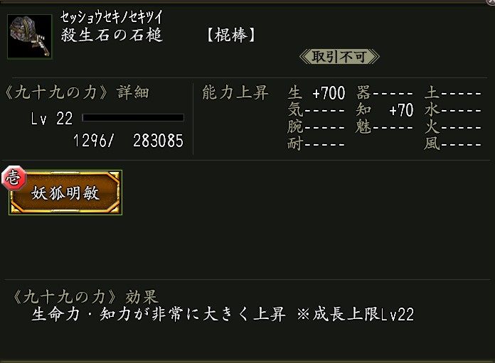 九十九の力「妖狐明敏」(黄金枠)がついた武器。