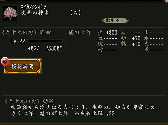 ※「桜花満開」は他の系統の九十九の力と重複扱いになりません。