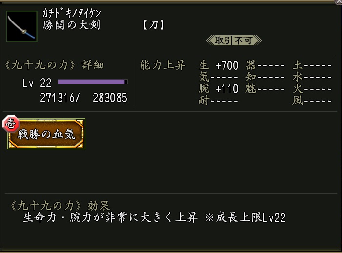 使用すると、下記アイテムを取り出せる。 NEW ●勝鬨の大剣(かちどきのたいけん)×1 効果:九十九の力「戦勝の血気(せんしょうのけっき)」が付いた武器。 ●三継九十九珠・極×1 ●九十九の源・極×30 ●九十九抽出具×3