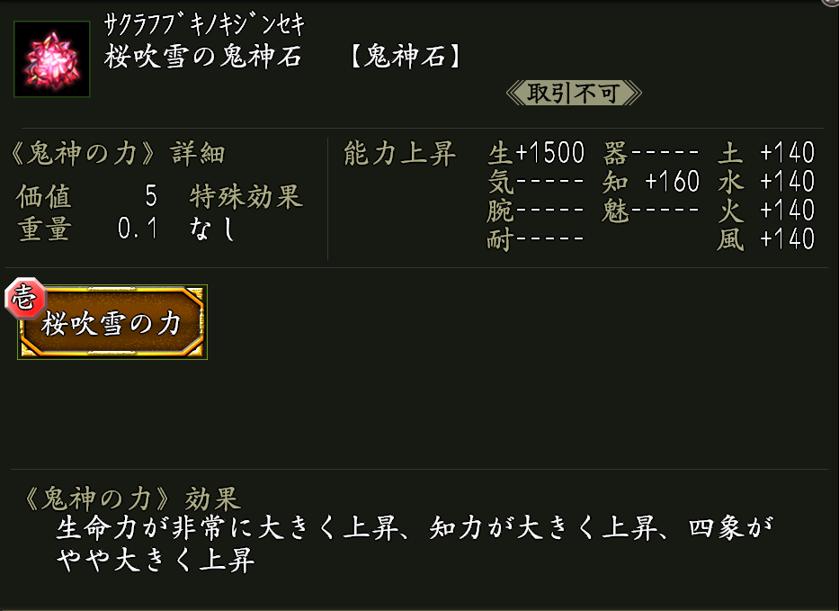 鬼神の力「桜吹雪の力」が付いた鬼神石。
