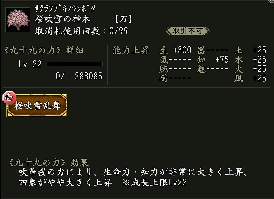 効果:九十九の力「桜吹雪乱舞」(黄金枠)がついた武器。