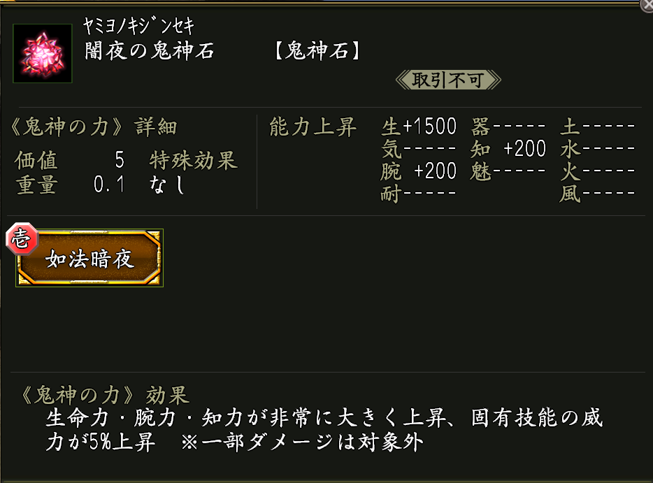 鬼神の力「如法暗夜(にょほうあんや)」が付いた鬼神石。