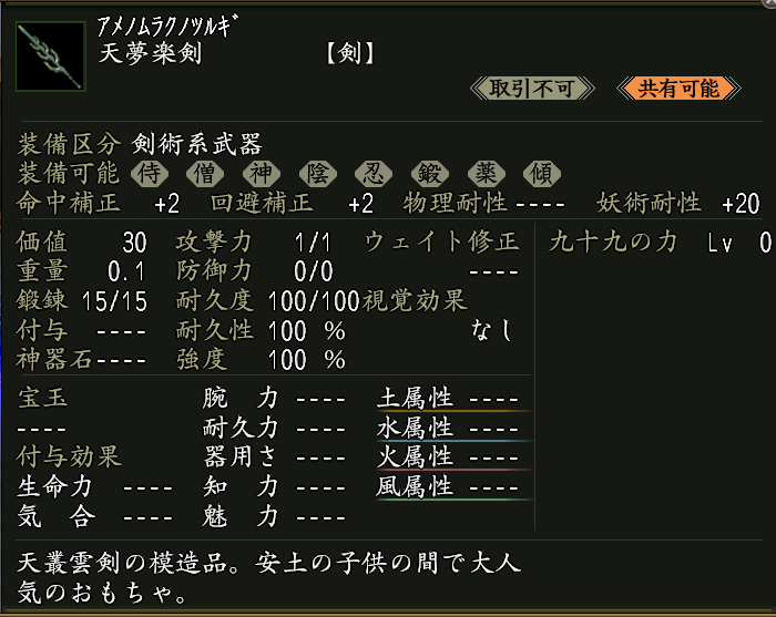 使用すると、下記アイテムを取り出せる。 ●桜子の喚鈴袋・お×2 ●天夢楽剣×1