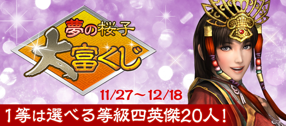 使用すると、下記アイテムから1つ選んで取り出せる。 ●桜子の褒賞袋・い×1 ●お供出会大箱・九×1 ●家臣闘練用具小包×5 ●英傑の招喚鈴・お×2 ●軍神おみくじ・七×10 |