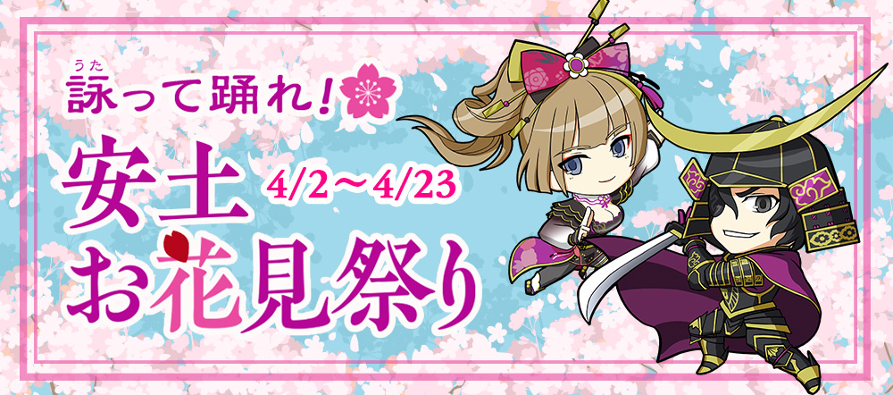 強力な九十九武器や鬼神石のほか、プレイヤーキャラクターや英傑・軍神を強化するアイテムを確率で入手できる宝箱、春らしい旗指物や家具などが登場します。