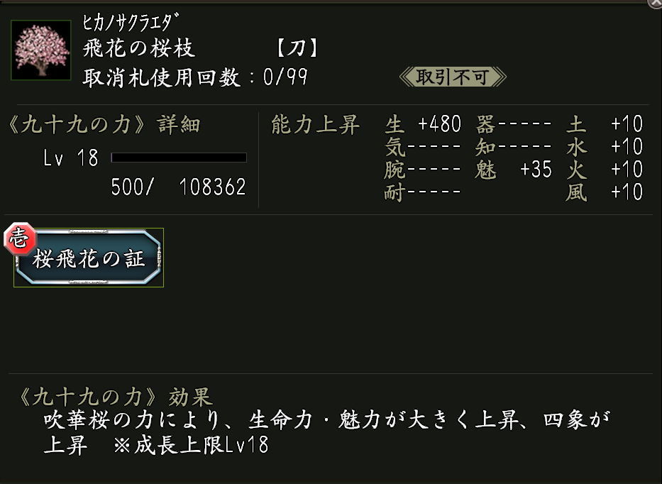 ※九十九の力「桜飛花の証」を合成していくことで、最終的に「爛漫桜飛花」が発現する場合があります。