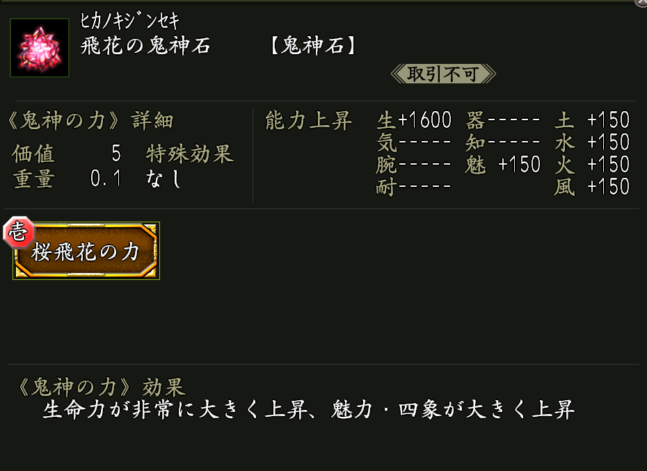 効果:鬼神の力「桜飛花の力(さくらひかのちから)」が付いた鬼神石。
