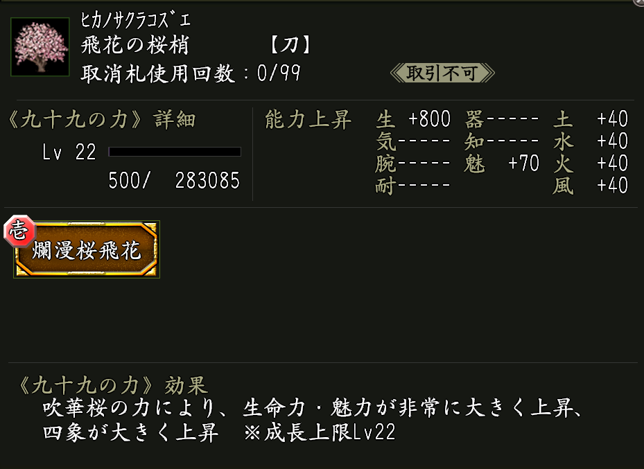 効果:九十九の力「爛漫桜飛花(らんまんさくらひか)」(黄金枠)がついた武器。