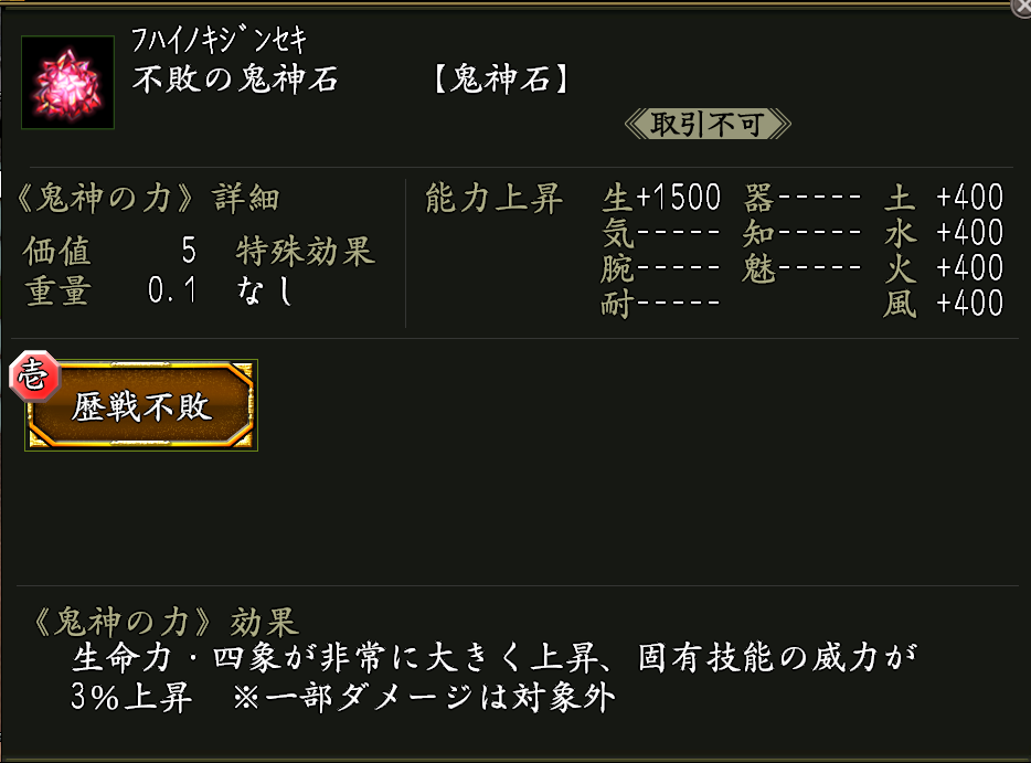 鬼神の力「歴戦不敗(れきせんふはい)」(黄金枠)が付いた鬼神石。