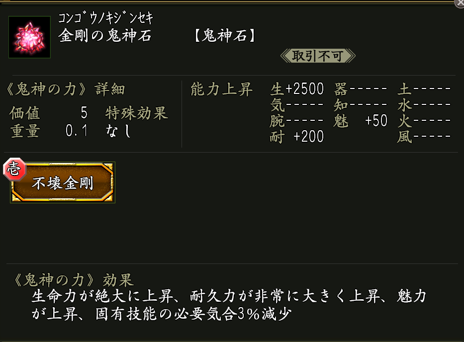 鬼神の力「不壊金剛(ふかいこんごう)」(黄金枠)が付いた鬼神石。
