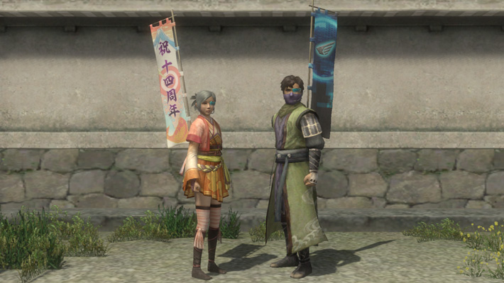 十四周年旗印 | 『信長の野望 Online』十四周年を祝う旗印。イベント期間中に身につけると、入手できる前夜祭ポイントが増加。 |