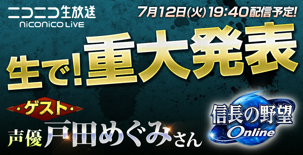 『信長の野望 Online』の最新情報をお届けするインターネット番組「プレゼント付き夏の重大発表」を、7月12日(火)夜にニコニコ生放送にて行います。開発陣の出演だけでなく、声優の戸田めぐみさんにもMCとして番組にご参加いただきます。《放送は終了しました》