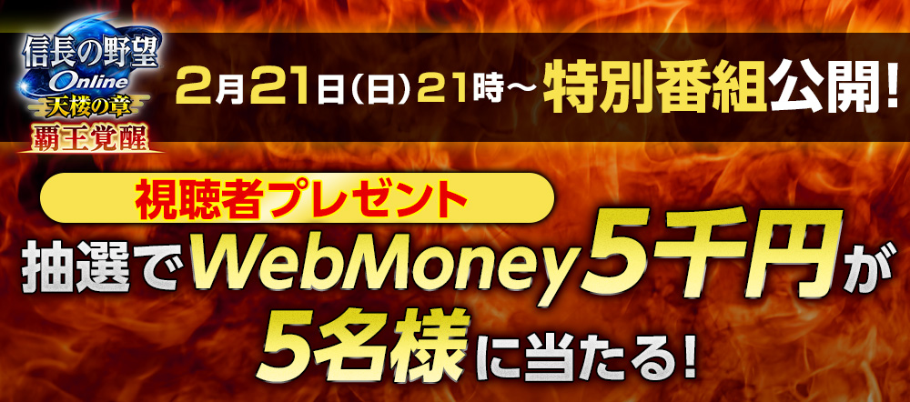 公式放送の視聴者の方にゲーム内で使用できる特典アイテムや、抽選で5名様にWebMoney5,000円分をプレゼントいたします。