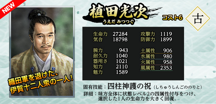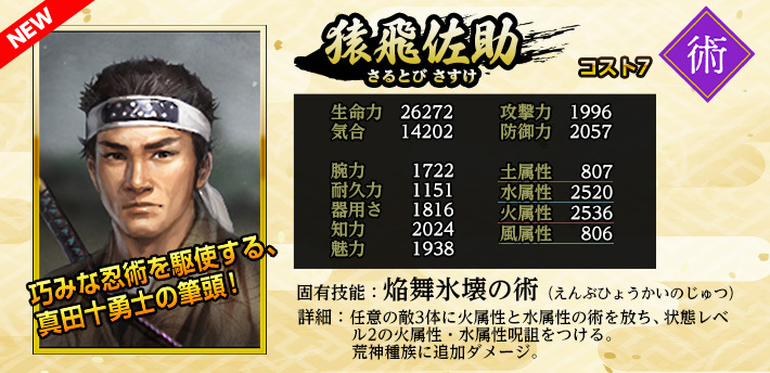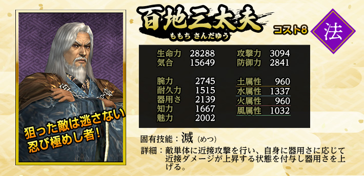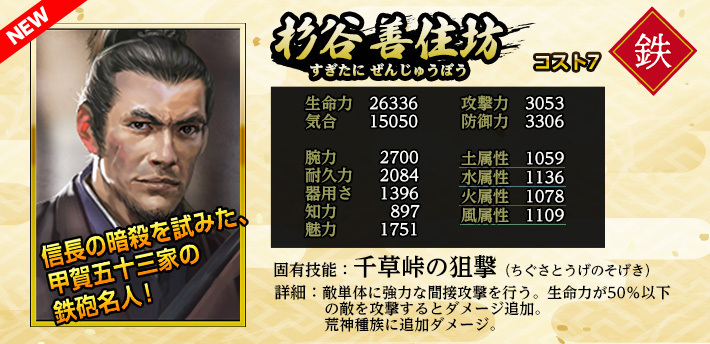 ※2021年11月10日(水)メンテナンスにて、《百地三太夫》の能力値を上方修正しました。既に仲間に入っていた場合も、当修正は適用されます。
