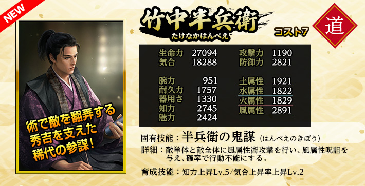 使用することで「英傑」を仲間にできる。 《英傑の招喚鈴・れ》の英傑に加え、《竹中半兵衛》《黒田官兵衛》の両英傑が登場する。 入手済みの英傑が重複した場合、入手の代わりに限界突破が発生します。限界突破は最大4回で、以降は等級に応じた「英傑の零力」が手に入ります。 |