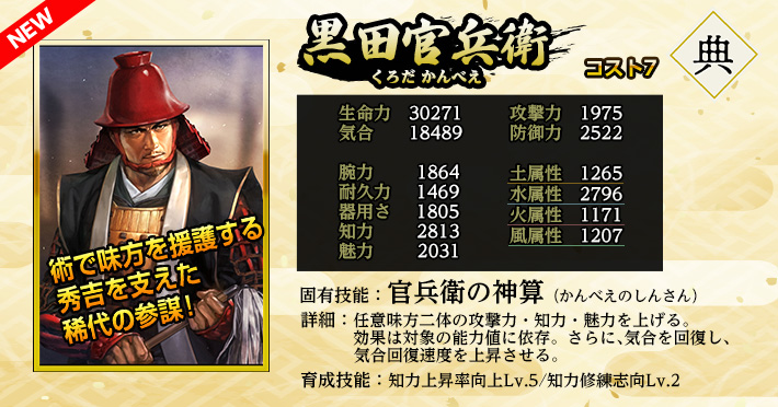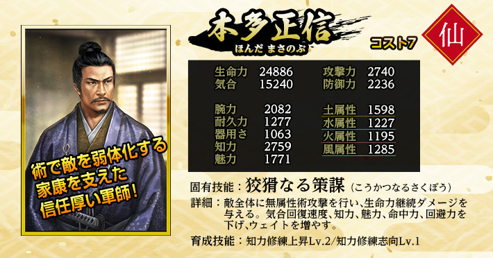 | 魅力上昇率向上Lv.1 | 家臣闘練で修練内容に配置された時に、魅力の上昇割合を上げる。 | ||||