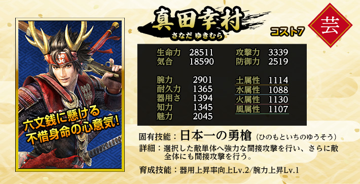 | 腕力修練上昇Lv.1 | 家臣闘練で腕力関連の修練に配置された時に、腕力の上昇量を上げる。 | ||||