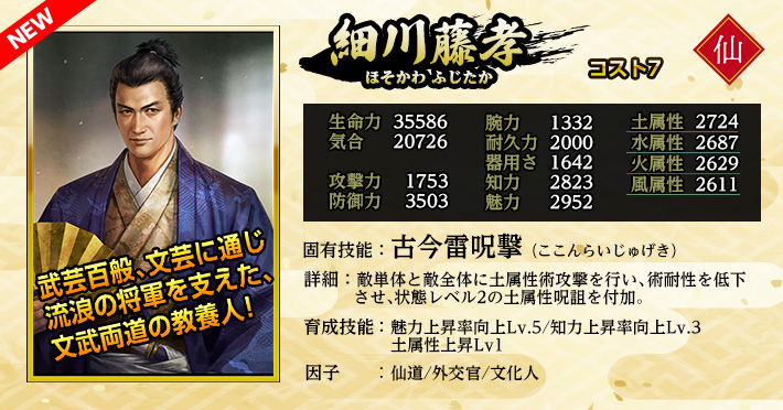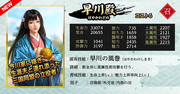 使用することで「英傑」を仲間にできる。 《英傑の招喚鈴・な》の英傑に加え、英傑《細川藤孝》《宇喜多直家》《早川殿》が登場する。 入手済みの英傑が重複した場合、入手の代わりに限界突破が発生します。限界突破は最大4回で、以降は等級に応じた「英傑の零力」が手に入ります。 |