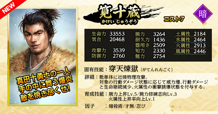 | 火属性上昇Lv.1 | 家臣闘練で修練内容に配置された時に、火属性の上昇量を上げる。 | |||||