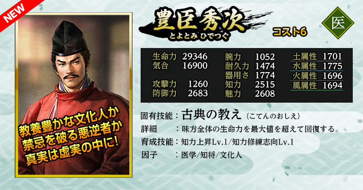 使用することで「英傑」を仲間にできる。 《英傑の招喚鈴・け》の英傑に加え、英傑《三好長慶・生殺》《筧十蔵》《豊臣秀次》が登場する。 入手済みの英傑が重複した場合、入手の代わりに限界突破が発生します。限界突破は最大4回で、以降は等級に応じた「英傑の零力」が手に入ります。 |