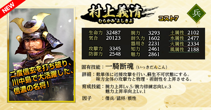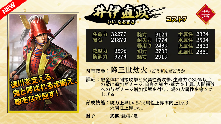 | 水属性上昇Lv.1 | 家臣闘練で修練内容に配置された時に、水属性の上昇量を上げる。 | |||||
