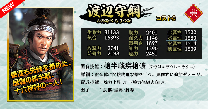 使用することで「英傑」を仲間にできる。 《英傑の招喚鈴・ふ》の英傑に加え、英傑《井伊直政・勇猛》《村上義清》《渡辺守綱》が登場する。 入手済みの英傑が重複した場合、入手の代わりに限界突破が発生します。限界突破は最大4回で、以降は等級に応じた「英傑の零力」が手に入ります。 |
